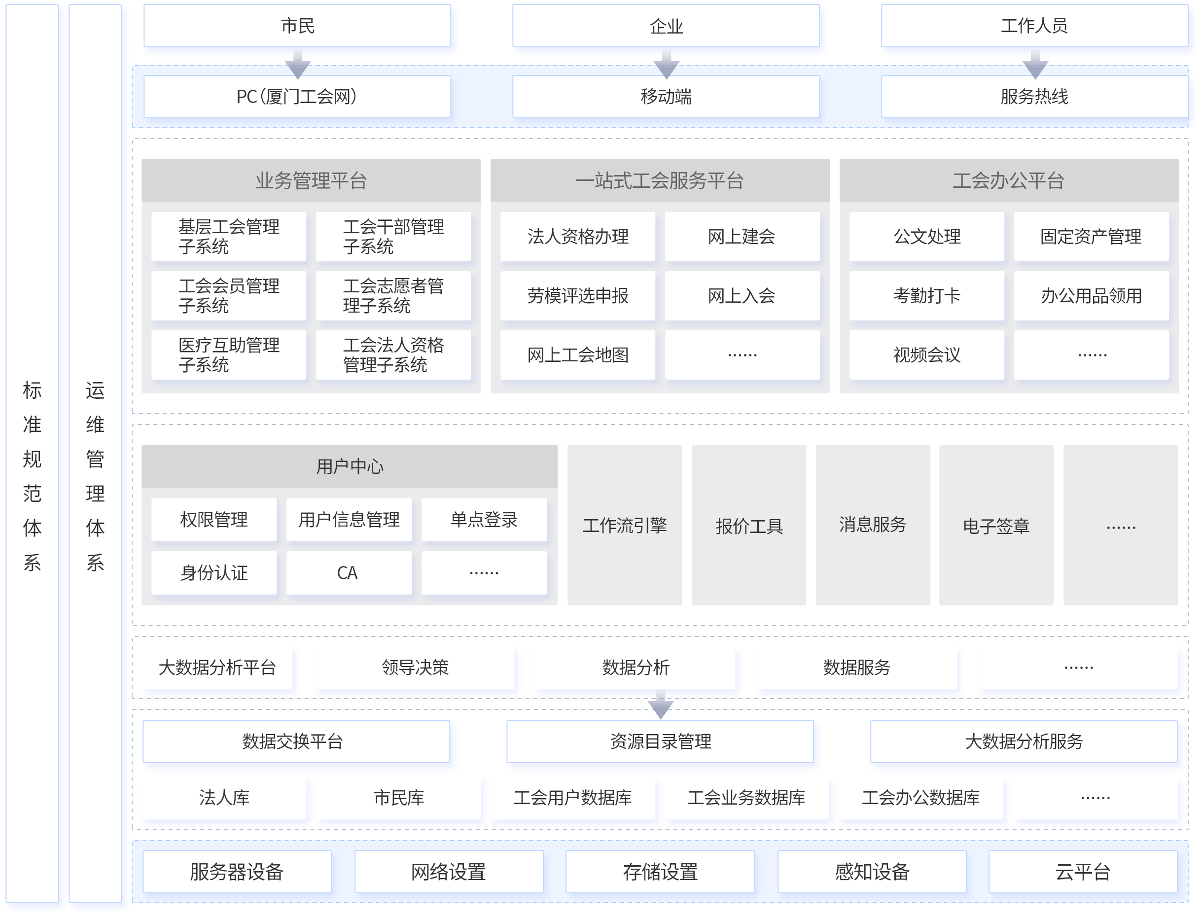 为工会体系内各个单位组织提供集办公、沟通、服务和管理于一体的各类信息化服务。